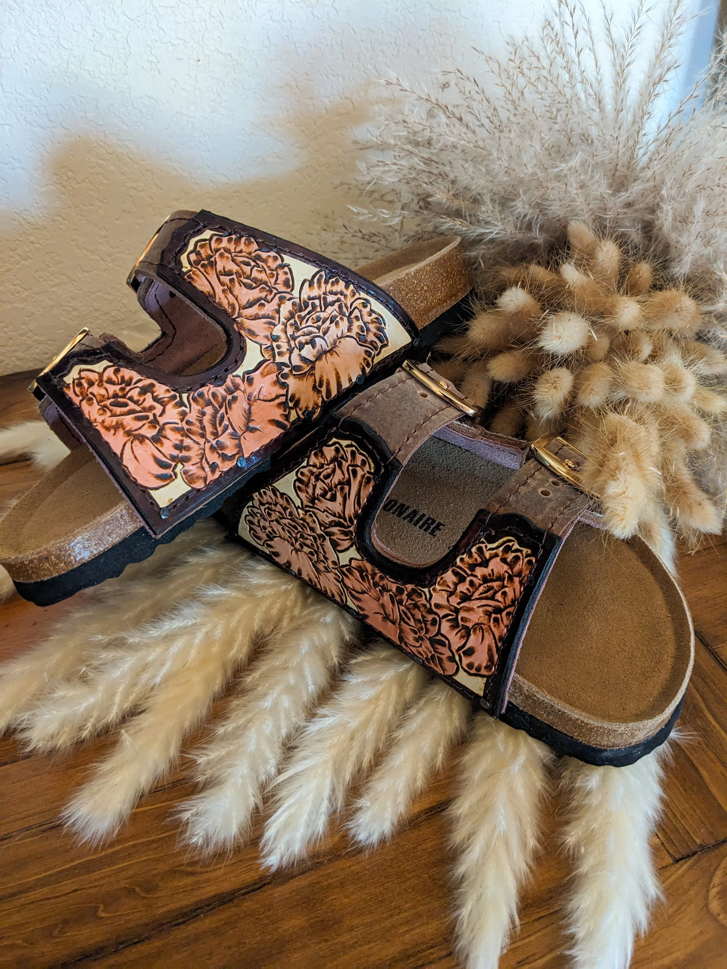 These size 7W sandals are everything! Tooled peonies, genuine ostrich leg hide, gold buckles and lined in mauve suede. Incredibly one of a kind and never to be duplicated. The base of these cork sandals is by Cushionaire, similar to Birkenstock but way more affordable. I wear a pair of custom sandals and typically wear 8.5 and can comfortably wear 8.5-9 in this brand of sandal. So I would say they are true to size. All the leather pieces are drawn, tooled, painted and constructed by hand by yours truly.